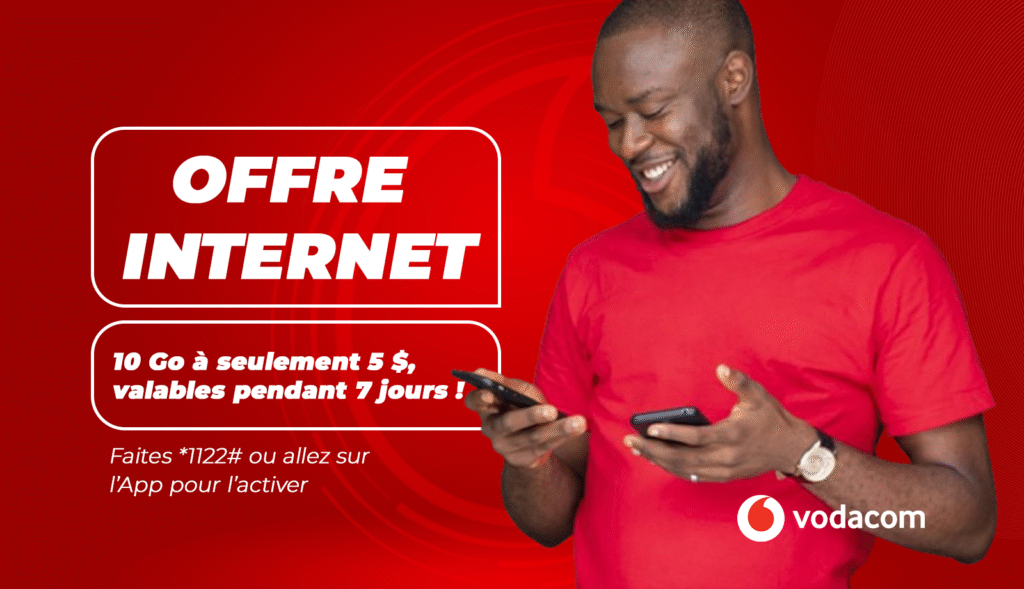 Avec Vodacom RDC, profitez de 10 Go d’internet à seulement 5 $ pour 10 jours. Une offre pratique, rapide et économique pour rester connecté partout en RDC.